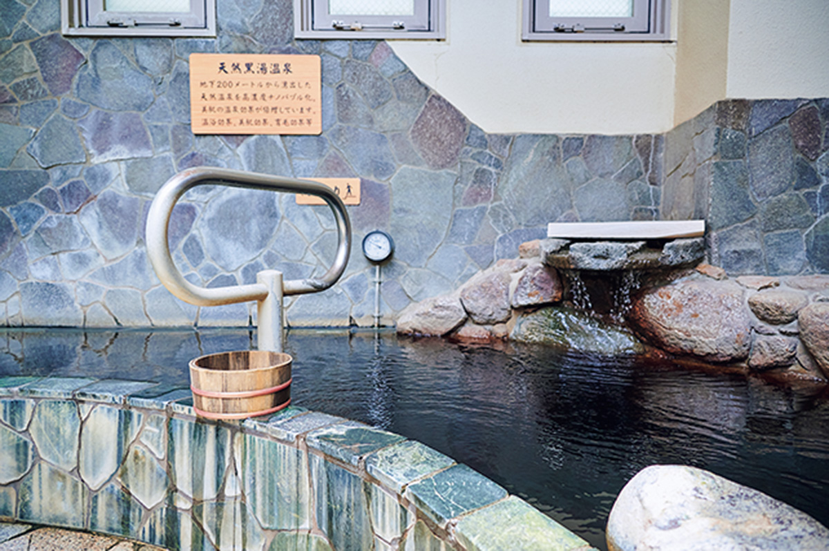 初代と二代目が築いた温泉を、三代目が守る。自慢は「黒湯」と「黄金の湯」、自家源泉の2種類の天然温泉だ。外の空気が気持ちいい露天風呂とサウナもあるので、気軽に日帰り温泉気分を味わえる。