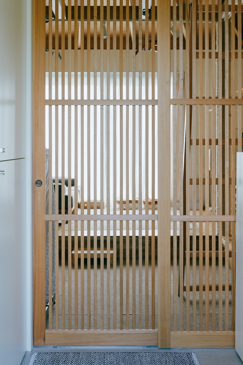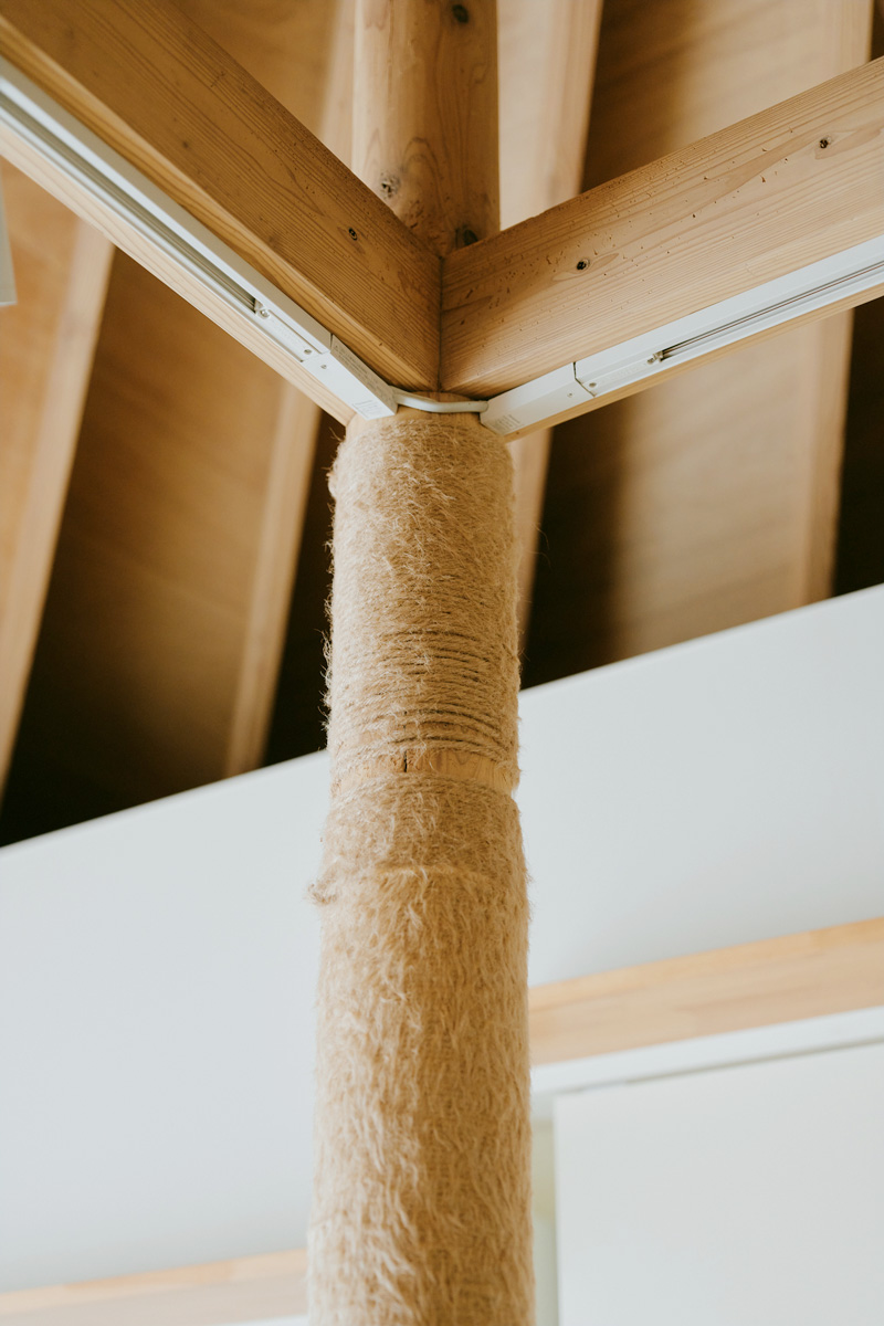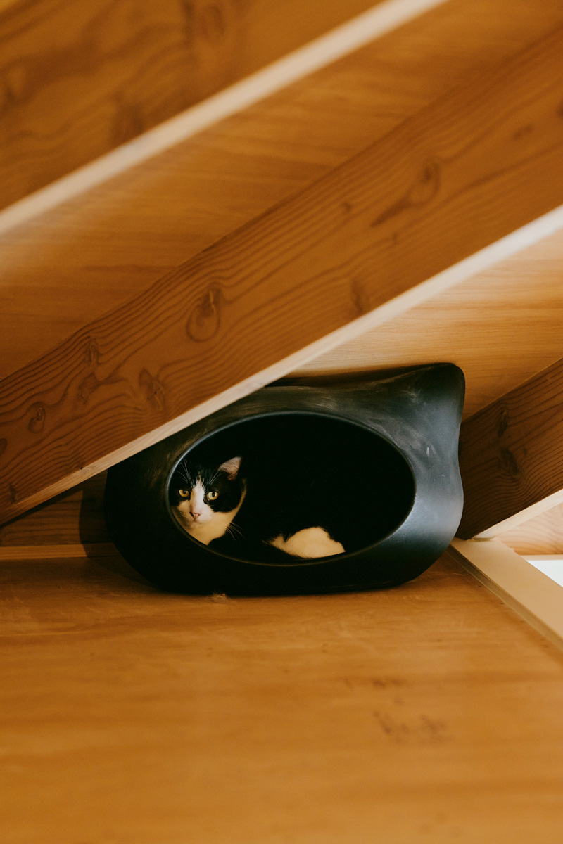 麻縄をぐるぐると巻き付けた柱を軽快に走り上がって、その先の棚板へ飛び移るとトトトと屋根裏へ消える猫チャン。壁に開けた猫穴からひょこっと連れ立って出てくるきょうだいの子猫チャン。かと思えば土間下の空間で物言いたげに香箱座りしている猫チャン……!! 猫好きならば悶絶するような光景が同時多発的に起き続けるこの家は、小椋崇弘さんと結さんの夫妻と6歳になる朱峯ちゃんの住まい。元々複数の猫と暮らしていたこと、動物病院で働く結さんの仕事柄、猫をはじめとする保護動物を一時受け入れる期間があることから、動物たちと無理なく同居できる住まいが欲しかったそう。緑深い山とその間を抜ける小川、近くには海と、自然に恵まれた集落に購入した土地に、奄美拠点の建築家・小野良輔さんの設計でこちらの家を建てた。