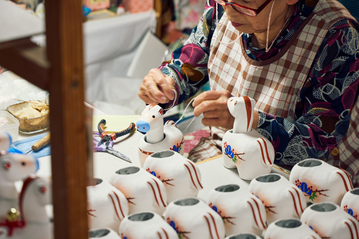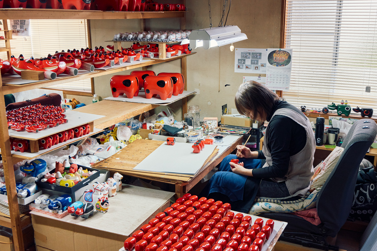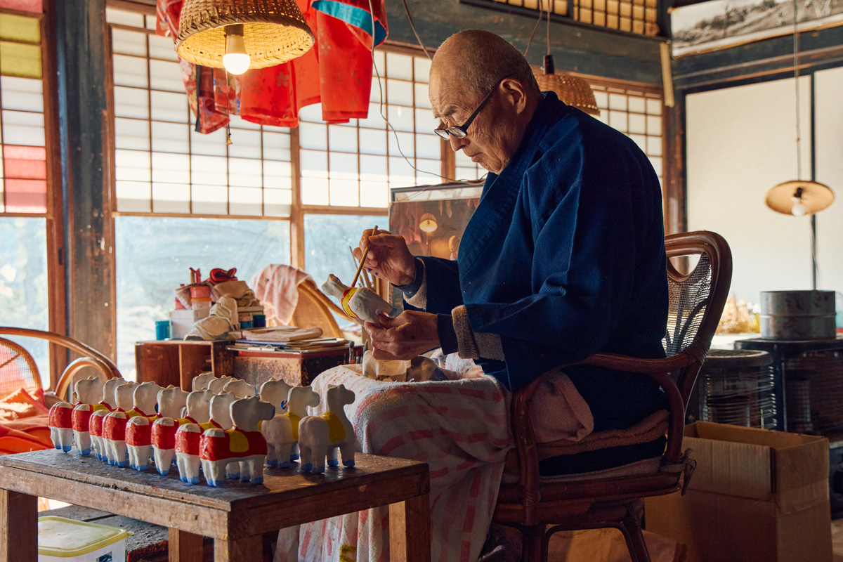 以来、ほとんど変わらぬ製法で、ダルマや干支人形を作ってきた集落には、今も4軒の工房が残っている。その一つが〈橋本広司民芸〉。17代目の橋本広司さんは、「いい張り子っていうのは、作った人の我(が)が見えないのよ」と言いながら、淡々と絵付けの筆を動かしている。
