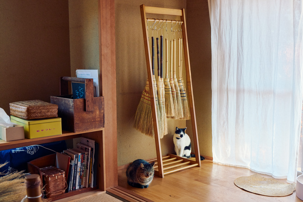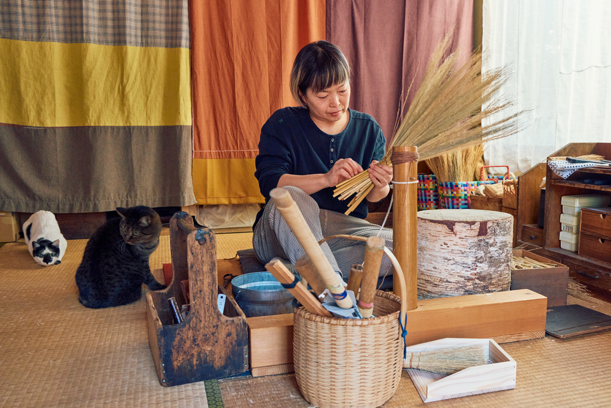 種から育てたホウキグサは柔らかさとテンションの強さの両方を備え、小さな埃もスッと絡めとる。「身近に置いて毎日使うことで、ほうきのある暮らしの心地よさや、長く受け継がれてきたほうき文化を知ってほしいんです」とおやまさん。編み上げる際の糸をホウキグサの種や自然のもので手染めしたり、「貴重な材料を無駄にしたくなくて」と、ホウキグサの切れ端を用いた小ぼうきを作ったり、隅々にまで愛情が込もっている。