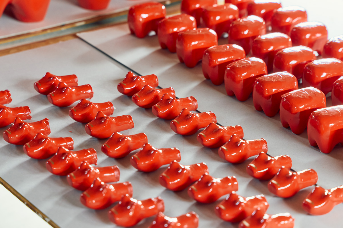 こう語るのは、父娘二代で張り子を作る〈野沢民芸〉の早川美奈子さん。桃色やミルク色など福島にまつわる色の「カラフルべこ」や伝統文様の「青海波(せいがいは)べこ」など、新しいデザインにも挑戦し、張り子ファンを増やしてきた。表面がなめらかで形がきれいなことも特徴。色を塗る前の段階で、表面に凸凹がないよう丁寧に磨き、貝を砕いた胡粉(ごふん)を塗って整えているそうだ。