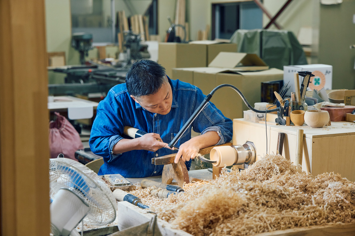 そんな関さんが4年前に始めたのが、木地師(きじし)・塗師(ぬし)・蒔絵師(まきえし)といった若手漆職人の自立を応援するシェア工房。ローカルハブ〈ヒューマンハブ天寧寺倉庫〉内にあり、建物には地元の食品や漆器が並ぶショップやカフェも。多様な目的をもつ人が訪れることで、会津塗の魅力がもっと広がれば、と願っている。