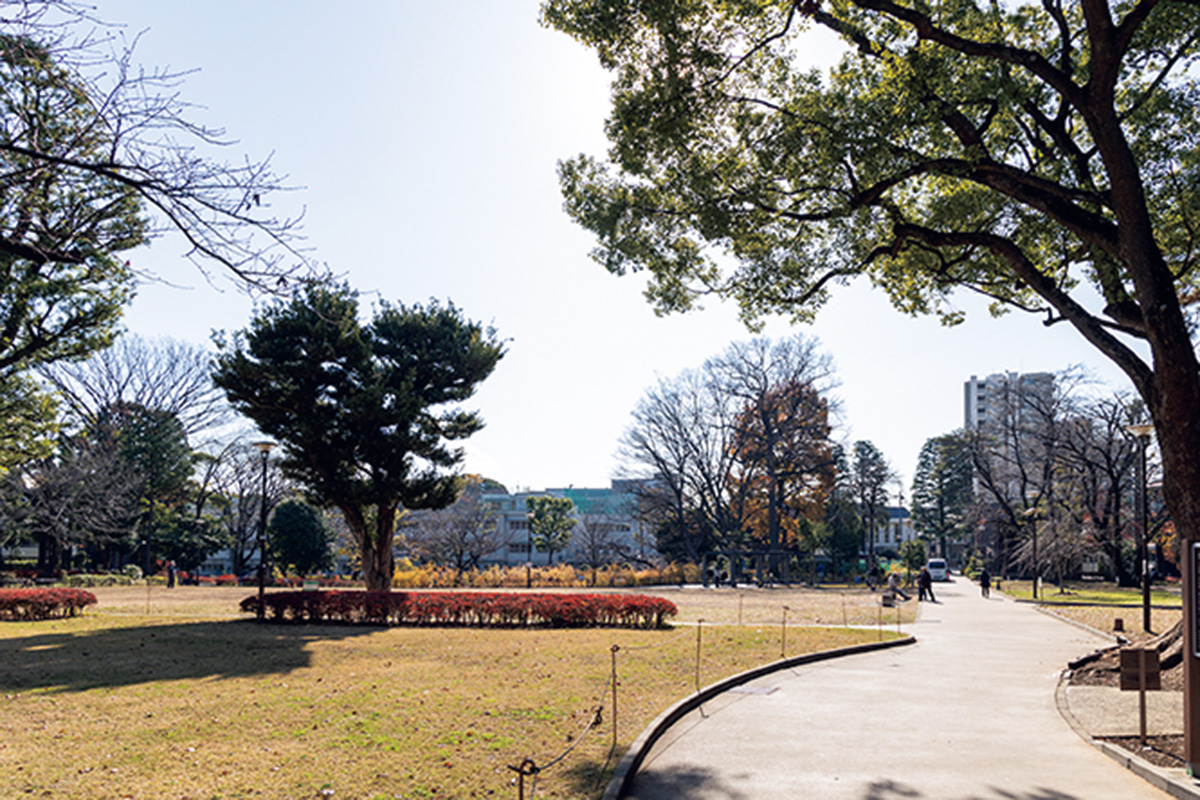 国文学研究資料館跡地を整備し2013年に開園した公園。かつて肥後熊本藩細川家の下屋敷だったため広大な敷地と池など大名庭園としての名残があるこの場所は、1918年に三井家により事務棟と書庫の2棟が建設され、現在も残る第二書庫は、中には入れないが日本最古の壁式鉄筋コンクリート造建物として貴重な存在。