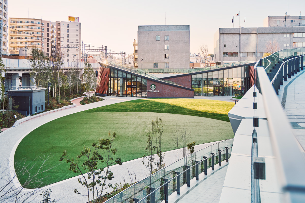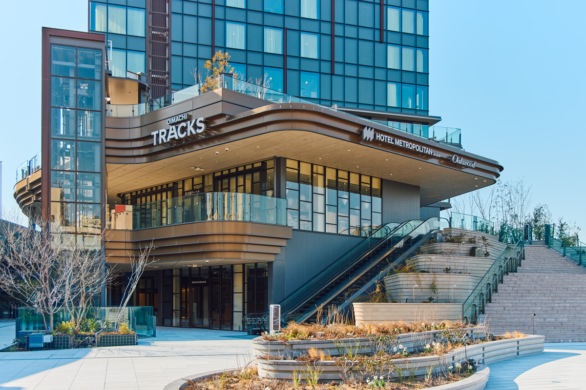 再開発によって、まちの新しいランドマークとなる複合施設が誕生するのは、いまやひとつの定型。ただし〈OIMACHI TRACKS〉は、都心部では珍しいアウトモール型(屋外通路に沿って店舗が並ぶスタイル)を採用している。