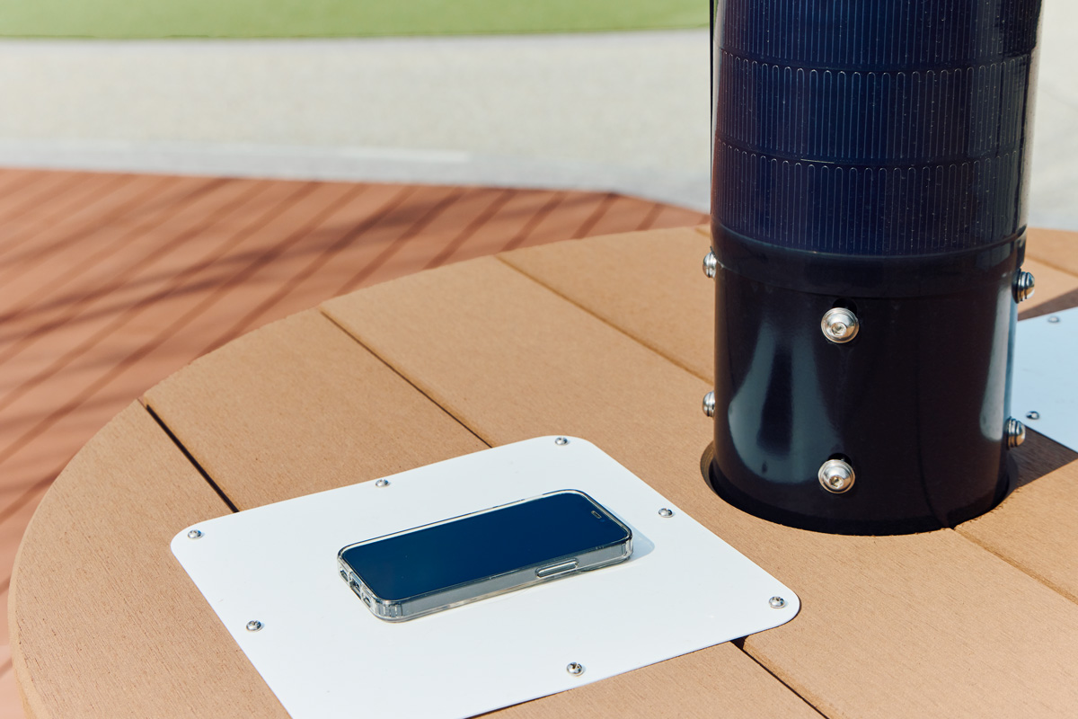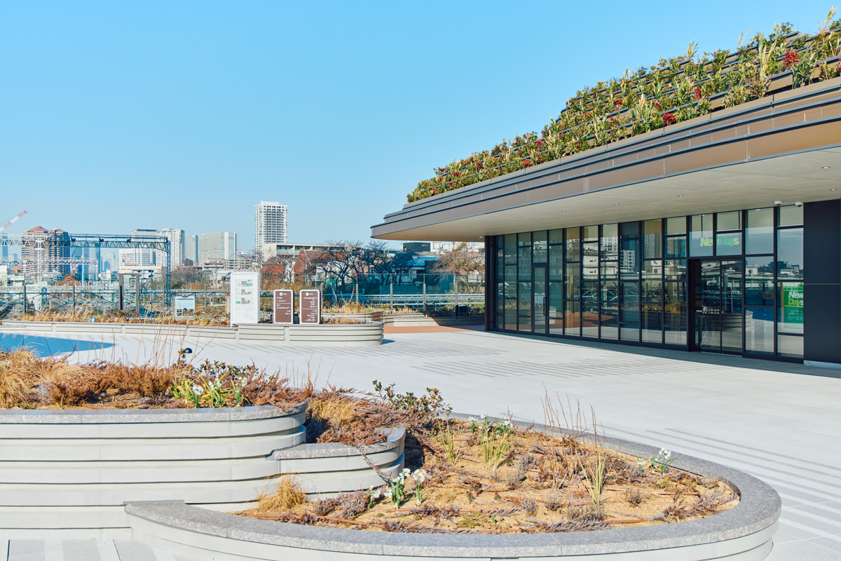 芝生の周辺には遊歩道や、ショップ&レストランへ続くスロープが整備されていて、散策を楽しむことも。今後は、広大な敷地を生かして、イベントなども実施されるそう。また災害に伴う延焼火災発生時には「広域避難場所」として機能。広場の一角にスマートフォン用のソーラー充電器が設置されていて、普段から利用が可能となっている。