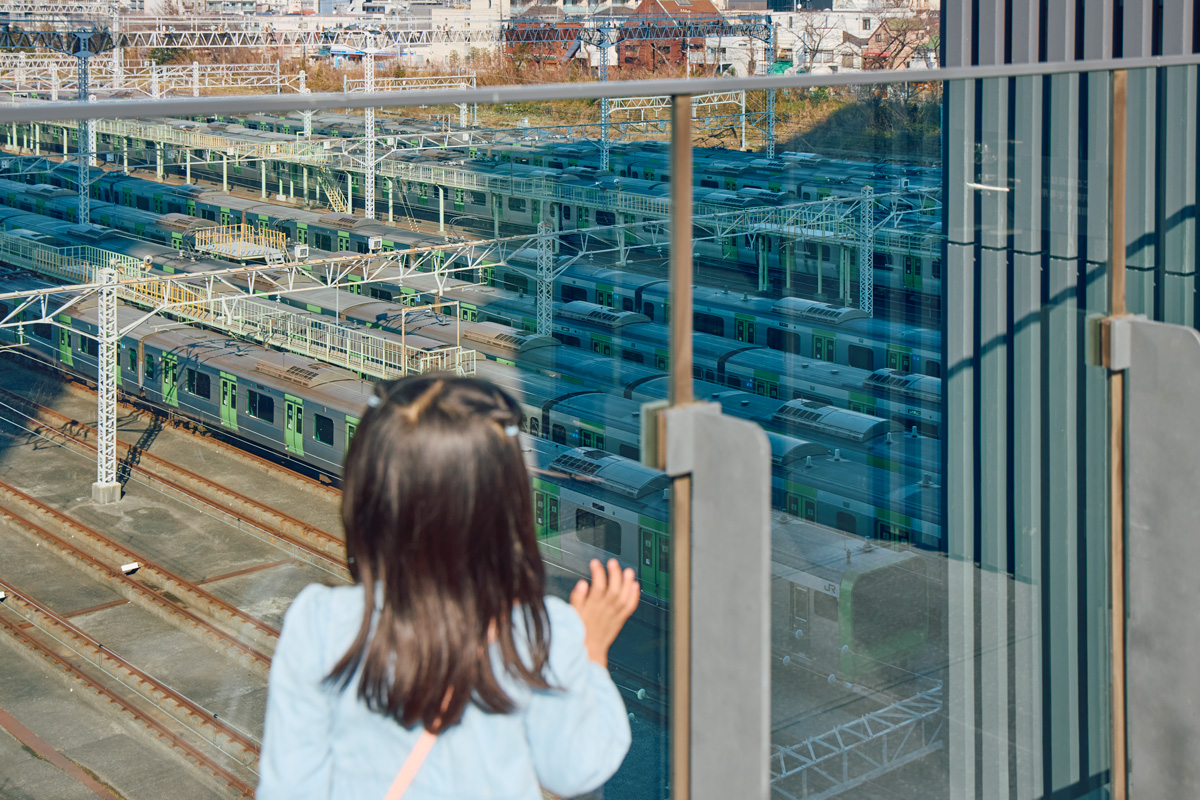 ショップ&レストランに背を向けて、北側のデッキから一望できるのが、山手線の車両基地。すべての山手線の車両が、毎朝この基地から“出勤”して、仕事を終えると帰ってくるそうで、時間帯によって出たり入ったりする様子を見下ろすことが。こまちちゃんも「電車がいっぱい止まってるよ!」と大喜び。