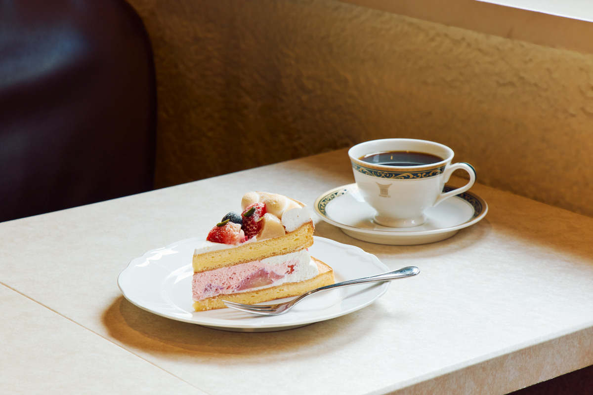 「ショートケーキ」「モンブラン」など、おなじみの洋菓子のほか、「昭和のナポリタン」「チキンピラフ」など、心惹かれる軽食メニューも。豆の品質・管理から提供まで、徹底的にこだわった「トアルコ トラジャコーヒー」を合わせて、ブレイクタイムを過ごしてはいかが。