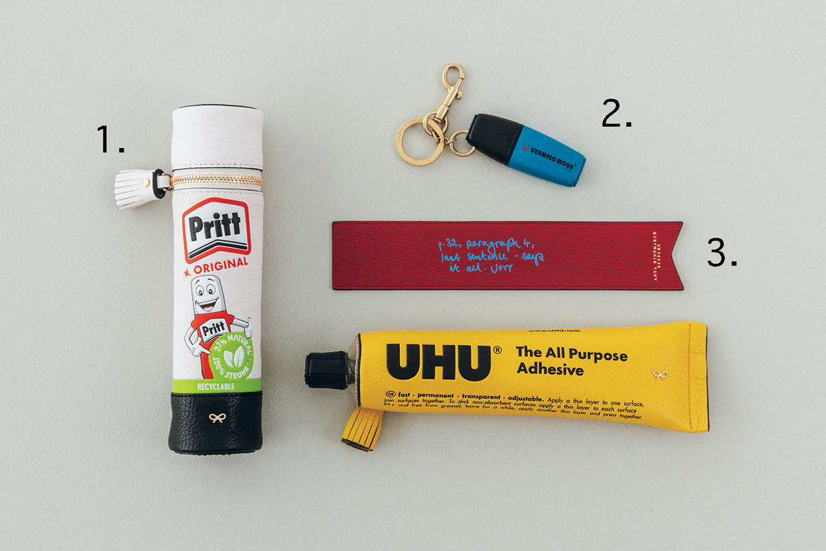 本物そっくりな見た目で卓上でも目立ちそう。タッセル付きジッパーで高級感も。ペンケースPritt Stick(W5×D5×H19.5cm)、UHU(W22×D5×H6cm)各64,900円(アニヤ・ハインドマーチ ジャパン)