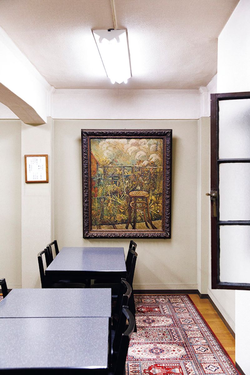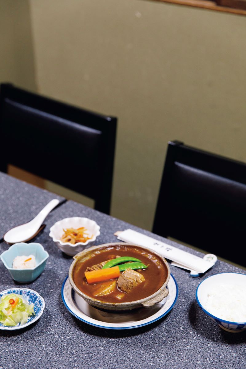 元々は蔵だった店内は、金庫の鉄扉など当時の趣がそのまま残る。小上がりの畳部屋、和風の座敷部屋だがテーブルと椅子が並べられていたりと、階ごとに違うしつらえはまさに和洋折衷。メニューはシンプルに、ビーフシチューとグラタンのみ。歌舞伎役者の楽屋への出前の名残から、熱々の土鍋で提供している。箸でホロッと崩れる柔らかいお肉は、パンではなくご飯と香の物で。