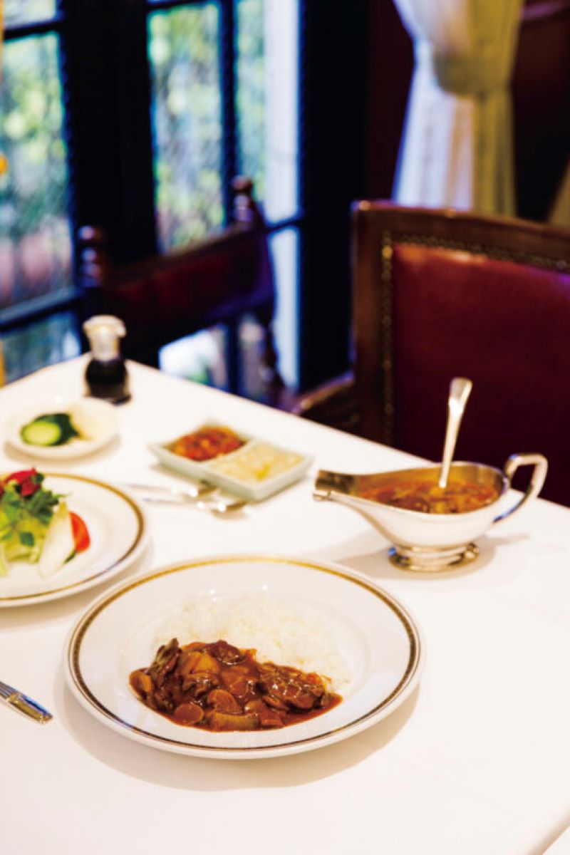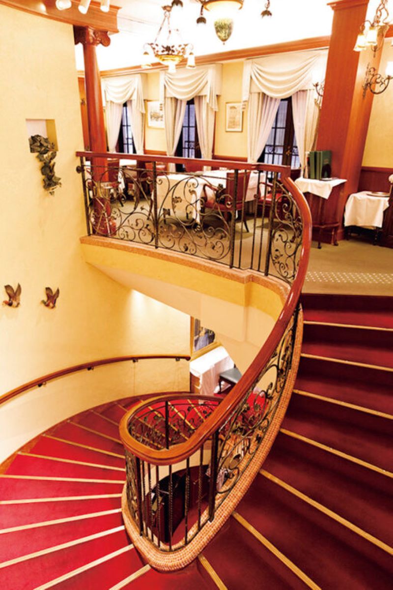 アイロンがかけられた白いクロスの上でいただくのは、フランス料理の真髄を受け継いだメニューばかり。「洋食というより、日本のフランス料理といったほうが正しいかもしれません。まずは琥珀色に輝くコンソメスープから」。赤い絨毯から2階へと続く螺旋階段、シャンデリアなどのインテリアまで。銀座の一等地らしく、隅々までおもてなしの心があふれる優雅な空間には、訪れた誰もがうっとりする。