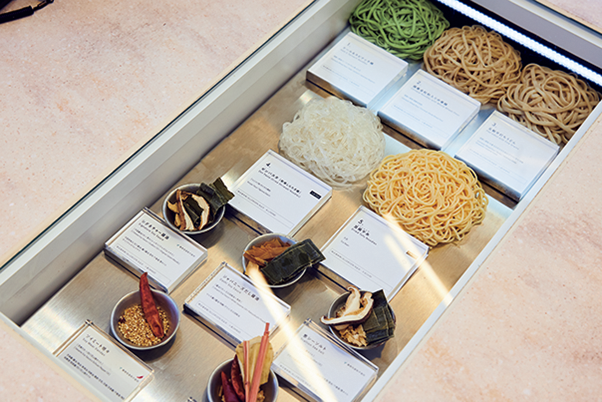 好きな麺と味付けを1種ずつ決め、それにのせるメインデリとサイドデリ、そしてトッピングを充実のラインナップから選ぶスタイルは変わらず。麺は5種あり、ケール&スピナッチ入り、豆腐干糸、ゼンパスタ(乾燥しらたき麺)など、よりヘルスコンシャスな内容で今の気分にぴったりだ。そしてヌードルではなくサラダプレートなら、気になる糖質はさらにセーブ。