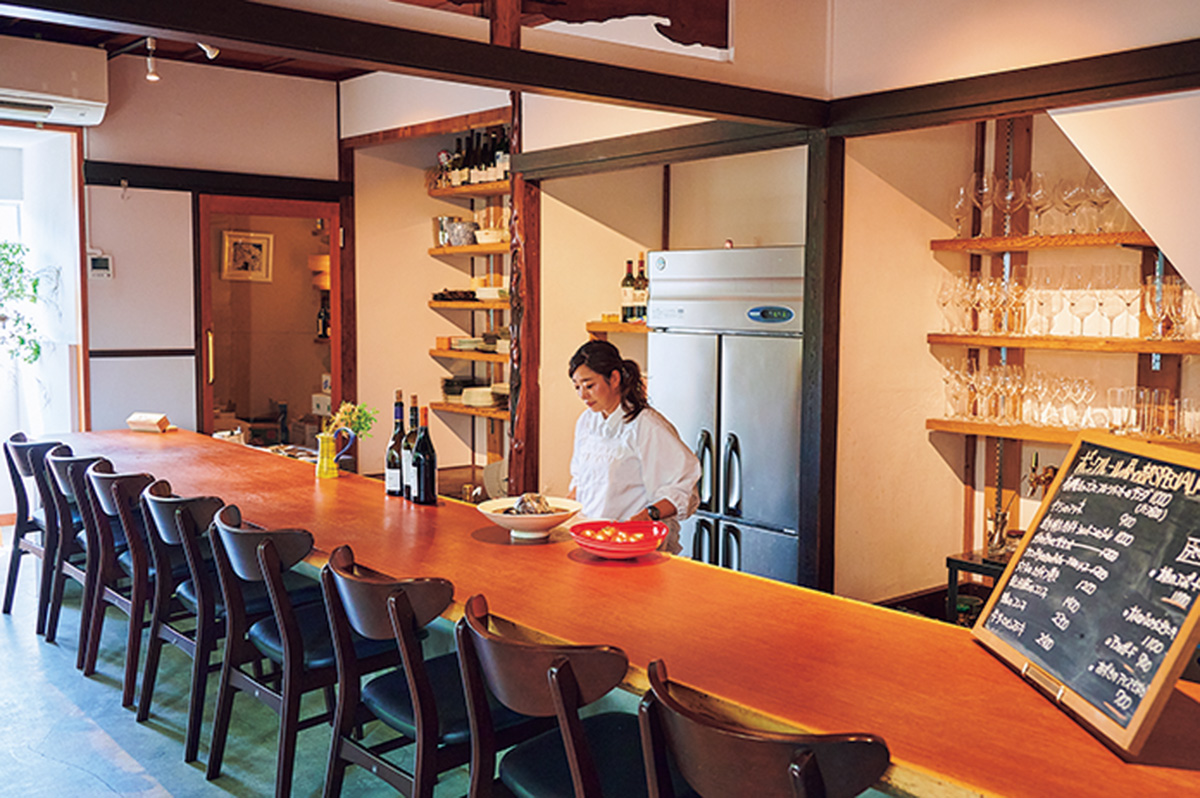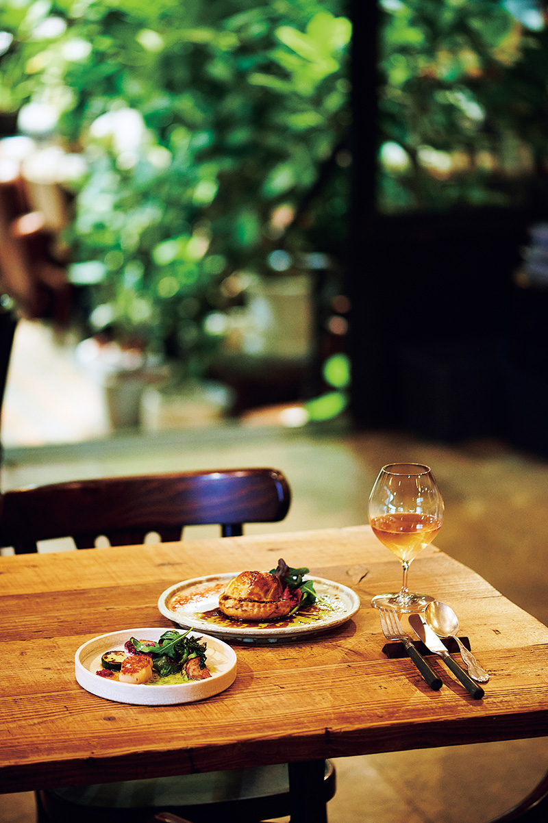 グリーンショップの扉を入った奥に店がある。オーナーシェフの武藤恭通さんが思い描いた、緑とレストランが寄り添う理想の物件だ。フランス・バスク地方の郷土料理を得意とし、ナチュラルワインにも精通している。益子などの作家ものやフランスのアンティークなど、器使いも素敵。武蔵小山や西小山にある仲間の店とイベントを開催するほか、国外のフードイベントでも活躍する。