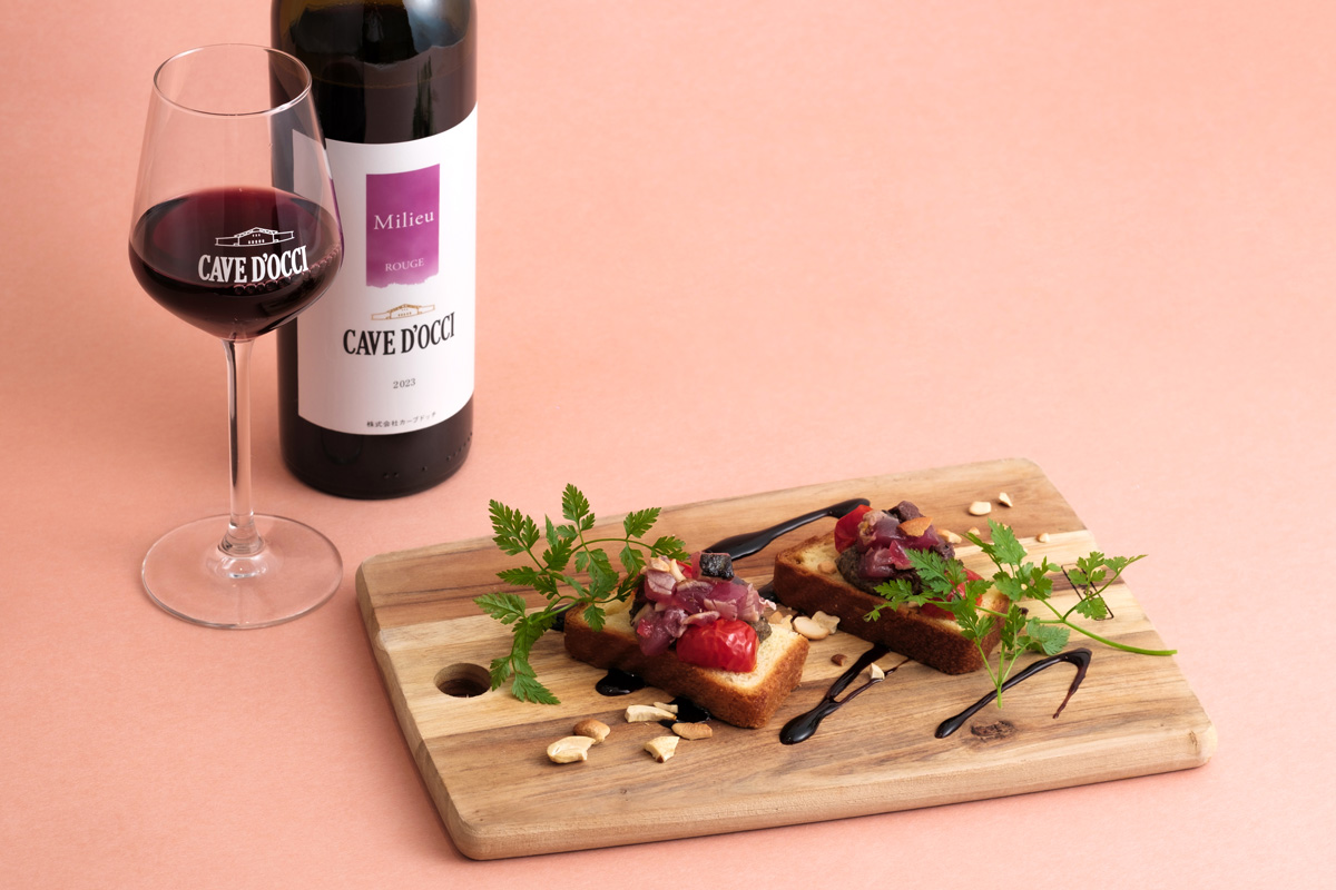 脂の乗った戻り鰹に、香ばしい秋茄子のピューレと、バター香るブリオッシュが調和する一品。ジューシーで軽やかな赤ワインが、風味を引き立てつつ優しくなじみます。