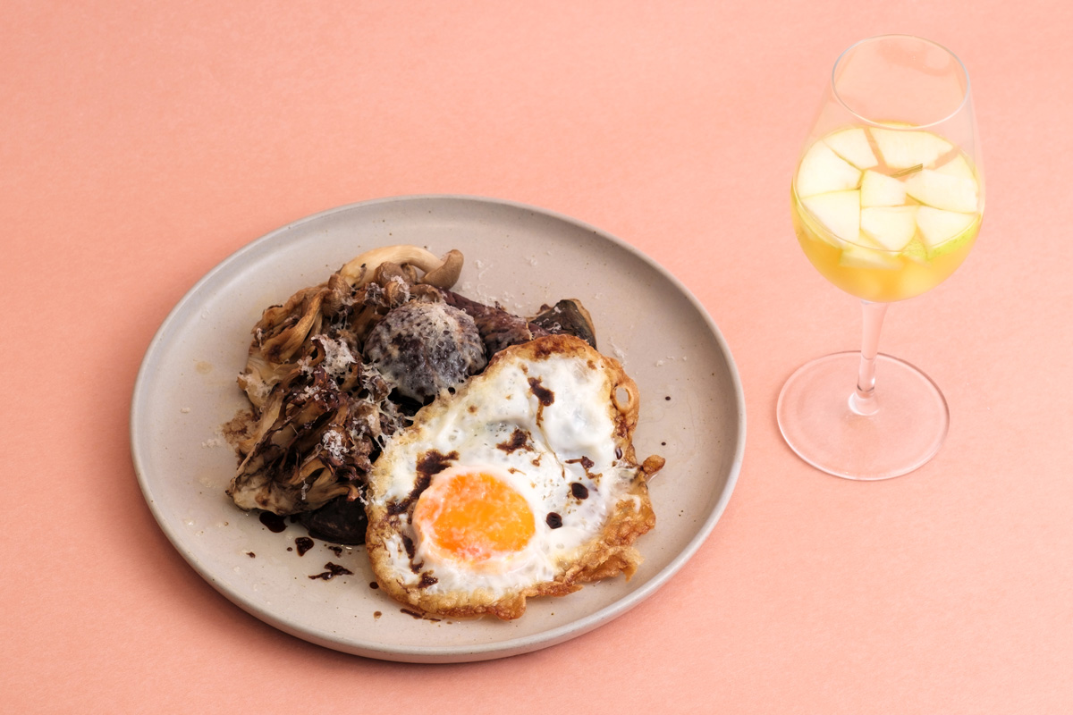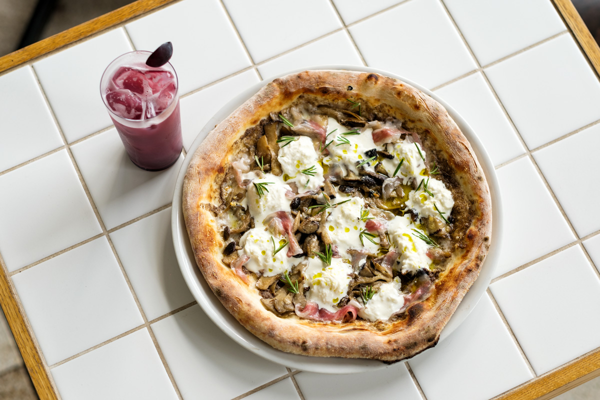 トリュフペーストを使ったクリームソースと、4種のきのこを香ばしくソテーし、たっぷりトッピング。焼き上がりにハモンイベリコとストラッチャテッラをのせた贅沢なピッツァ。ドリンクは、ホエイの柔らかな酸味をベースに、ぶどうの芳醇な果実味を合わせた大人の一杯を。