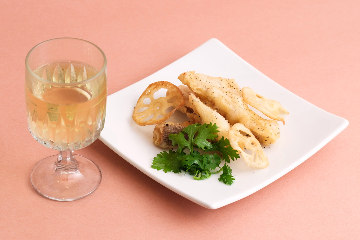 ホクホクの食感と自然な甘みが自慢の「宮本三兄弟」のレンコンを、軽やかな衣でカラリと揚げたフリット。仕上げの黒コショウがアクセント! ヴィーガンワインとセットで。