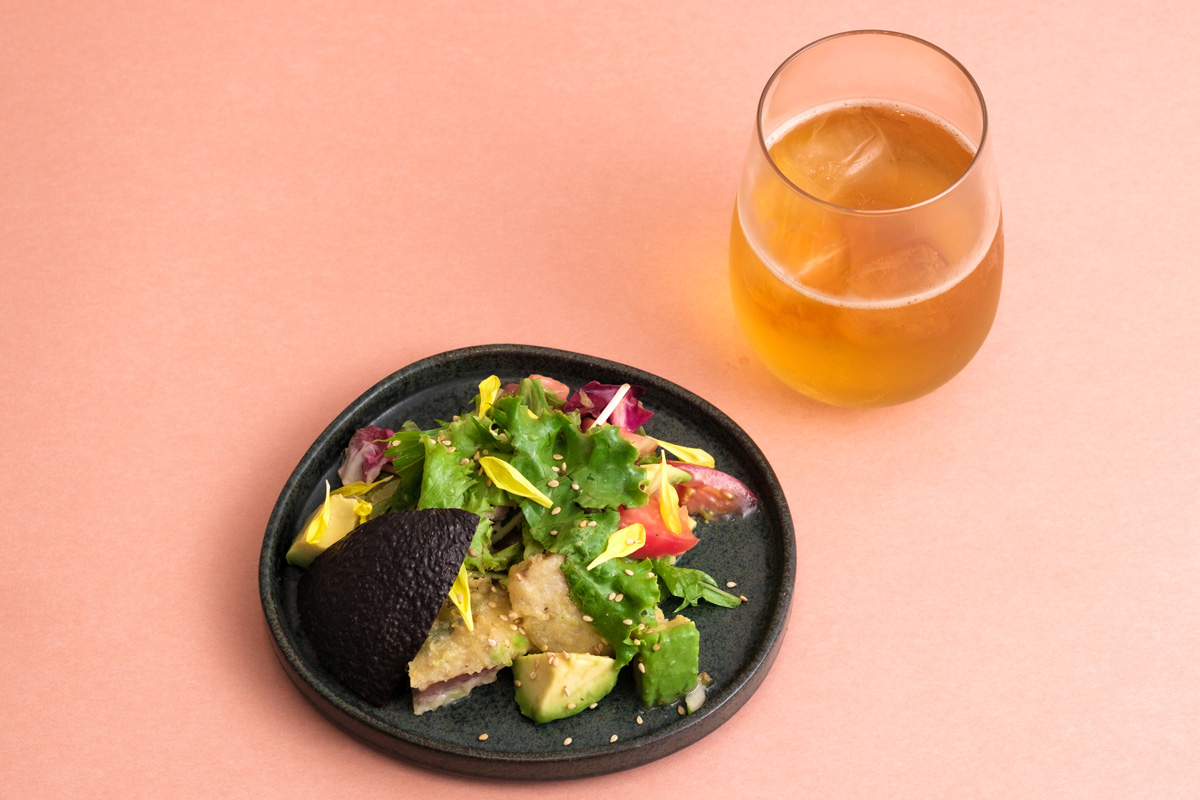 秋の味覚、秋刀魚の天ぷらを、アボカドとさっとマリネして風味豊かに。アップルバーボンのソーダ割りと一緒にどうぞ。