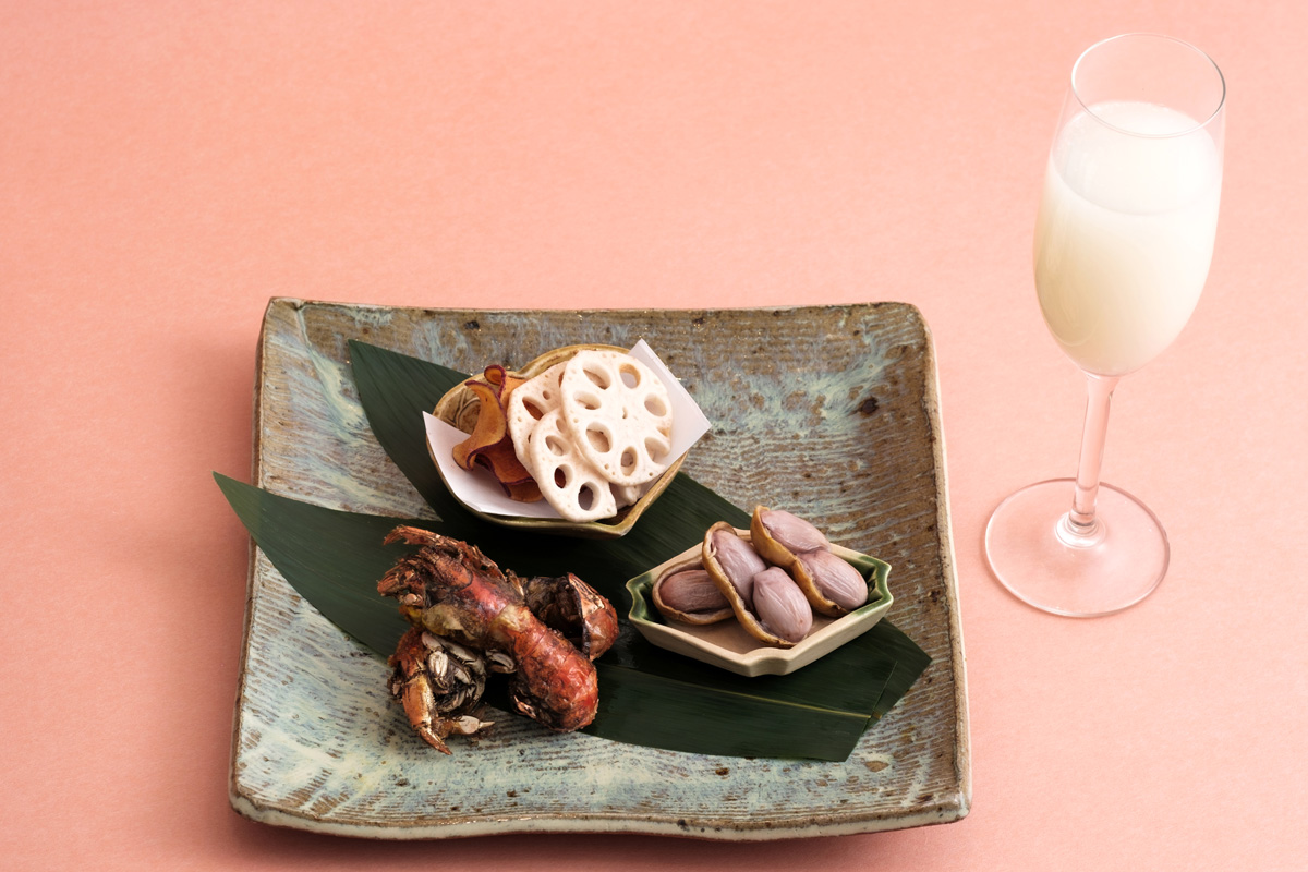 ドライで澄んだ味わいの日本酒スパークリングに、香ばしく仕立てた季節野菜のスナックと、マジャク(アナジャコ)素揚げ、滋味あふれる茹で落花生を添えて。軽やかでありつつ、ほっと心がほどける味わいで、食前のひとときを華やかに。