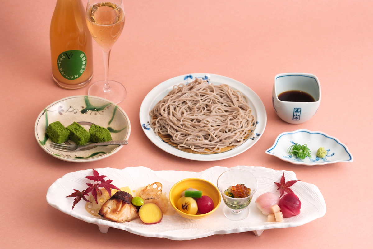 そばがみのイチオシを御膳風に提供する前菜盛り合わせ八寸と、店自慢のからすみそばを含む手打ちそば、甘味のセット。合わせるドリンクは、栃木県産のりんごの持つ自然な力のみで発酵させたナチュール製法のシードル。