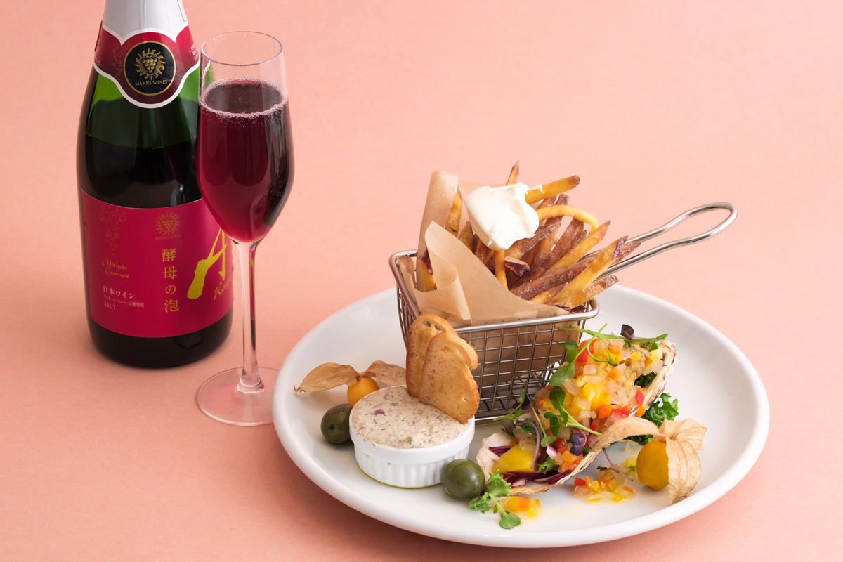 スイートポテトチップス ハニーバターソース、鯖のリエット メルバトースト添え、広島県産牡蠣と柿のエスカベッシュ、イタリア産グリーンオリーブと、旬の食材を盛り合わせ! マスカットベーリーAを使った軽快な赤スパークリングワインで、美味しい秋の夜長を。