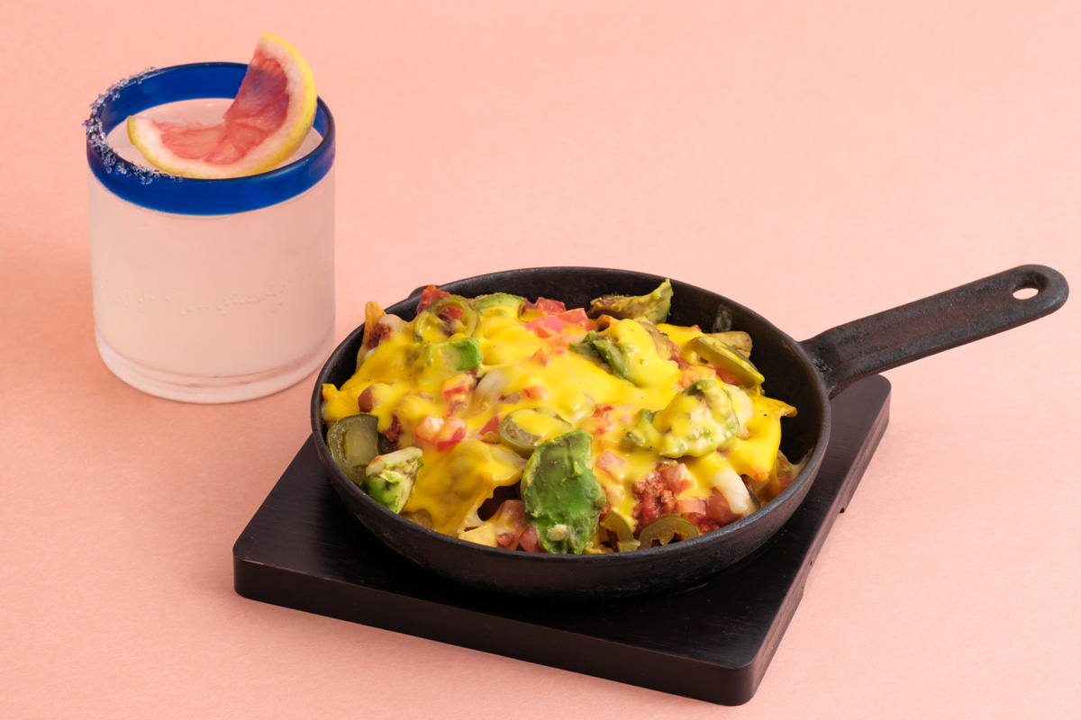 温かいチーズソースがたっぷりかかった、やみつきになるメルトチーズナチョス! スパイシーなハラペーニョとチリコンカンがアクセント。みんなでシェアするのもおすすめ。テキーラベースの爽やかなカクテルと合わせて。