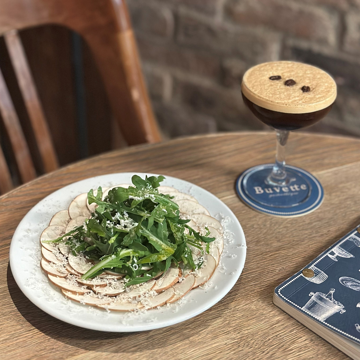 サラダは、マッシュルーム、ルッコラ、グラナパダーノに、素材の味を引き立てるレモンドレッシングを合わせて。「NOG COFFEE ROASTERS」の豆を使用したエスプレッソと、イタリア産のリキュールの「DI NERO」の上質な甘みをアクセントにしたマティーニと一緒に。