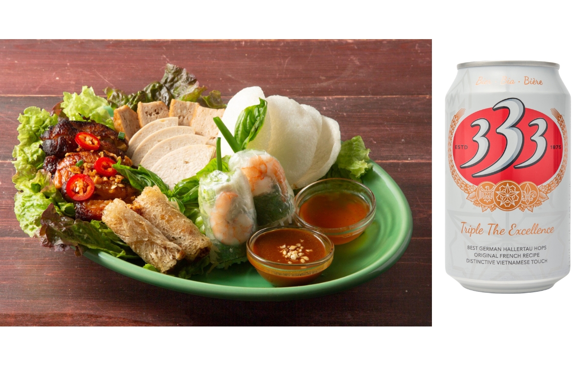 生春巻き、揚げ春巻き、鶏肉のココナッツ揚げ、チャークエ(ベトナム風フライドハム)、ゾールア(ベトナム風ポークハム)、海老せんべいの6種。香り、食感、味わいを一度に楽しめる贅沢な盛り合わせと、ベトナムといえばの333ビールの最強タッグ!
