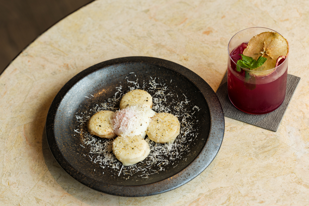 火を入れたホクホクの長芋に、イタリア産のタレッジョチーズと温度玉子をのせた濃厚な味わいの一品。美しい色合いのサングリアを合わせて、秋のアペロタイム!