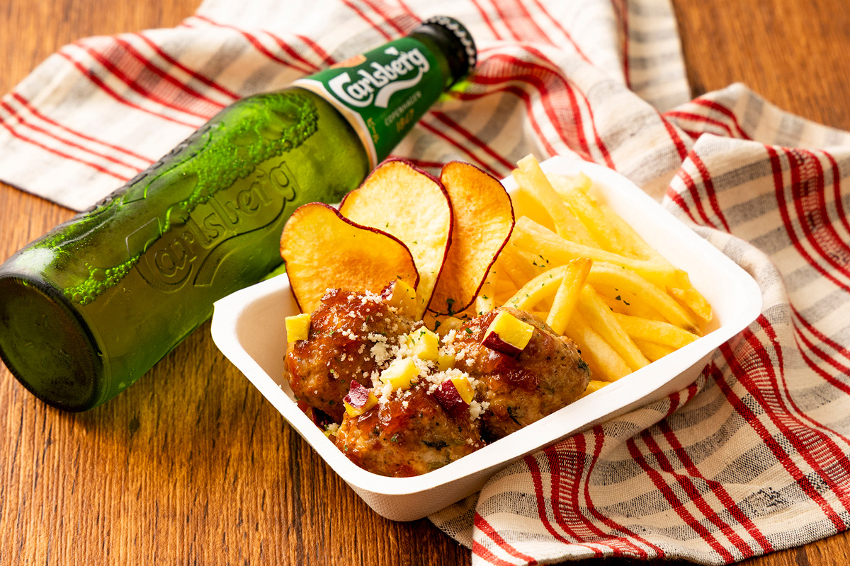 コクと旨味たっぷりのおろしオニオンソースにサツマイモをトッピングした、秋限定ソースのミートボール。合わせるのはもちろん、相性抜群のビールで!