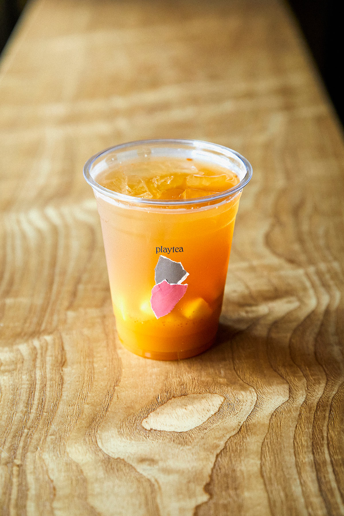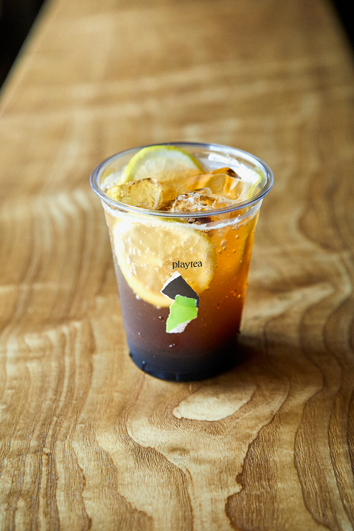 〈playtea〉で出合えるのはプーアル茶や日本茶をベースにしたオリジナルドリンク。抹茶や京番茶をベースにした京都限定のものから、フルーツティーやフローズンティー、生プーアル茶を使ったマサラチャイ、熟プーアル茶のミルクティーなど20種類ものアレンジティーが揃う。フルーツやスパイスなど味わいを重ねていても、ベースとなる茶の味わいはしっかりと口に広がり、余韻は上質な茶を味わったとき同様。2年をかけて開発したというレシピは、茶文化の奥深さを伝えるものとなっている。