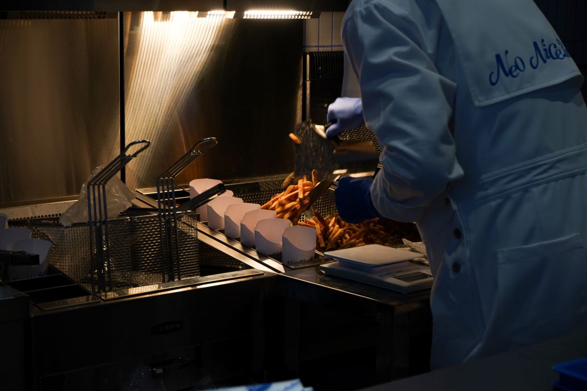 自社で運営するベーカリーの技術を生かし、配合や発酵時間のベストを探求したバンズはプレーン、ブリオッシュ、クラフトの3種を用意。ハンバーガーにかける手間と同様に、その相棒ともいえるポテトにも「いっさいの妥協なし」の心が。北海道産のホッカイコガネを太めにカットし、米粉などをブレンドした衣につけてから揚げることで、カリッとした食感のなかにほくほくとした甘みが感じられるよう試行錯誤を繰り返した。