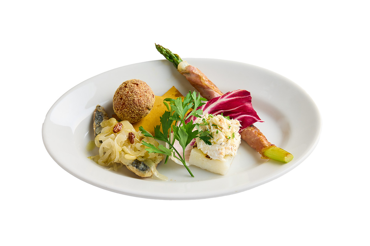 左から、“ヴェネトの三大前菜”ともいわれる「イワシのサオール」230円、「ミートコロッケ」230円、「バッカラマンテカート」260円と「アスパラガスの生ハム巻き」220円。