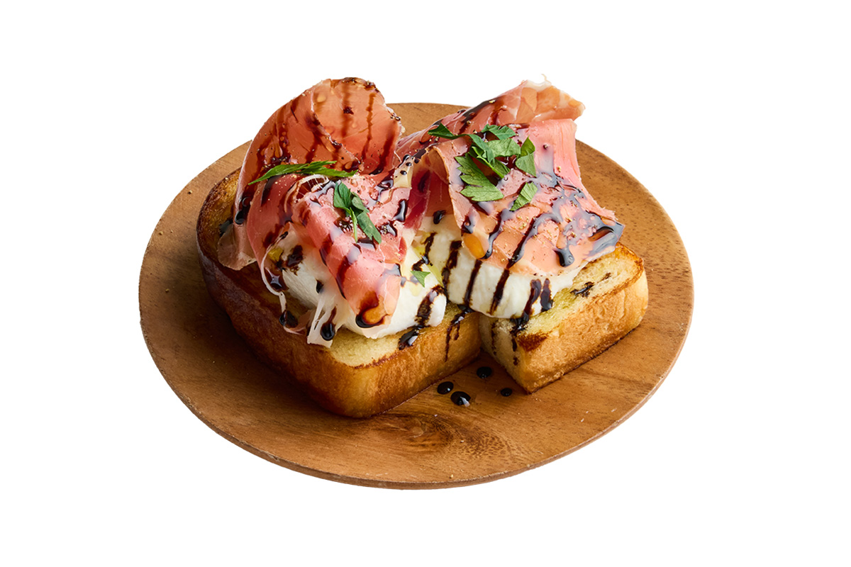 ふわっ&もちっとした食感が人気の自家製ミルクパンを使う「ブルスケッタ 生ハムとモッツァレラムース」660円。モッツァレラチーズにクリームを合わせたムースがとろける!