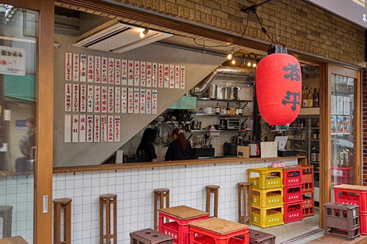 よみせ通りには〈呑平本店〉も完成した。開放的な空気感にイラストレーター師岡とおるさんが手がけたグラフィックも相まって、道行く人の視線を集め、早くも新名所の趣。2026年春には〈Liquors NODAYA〉とのコラボイベントを計画するなど地域との交流にも積極的だ。