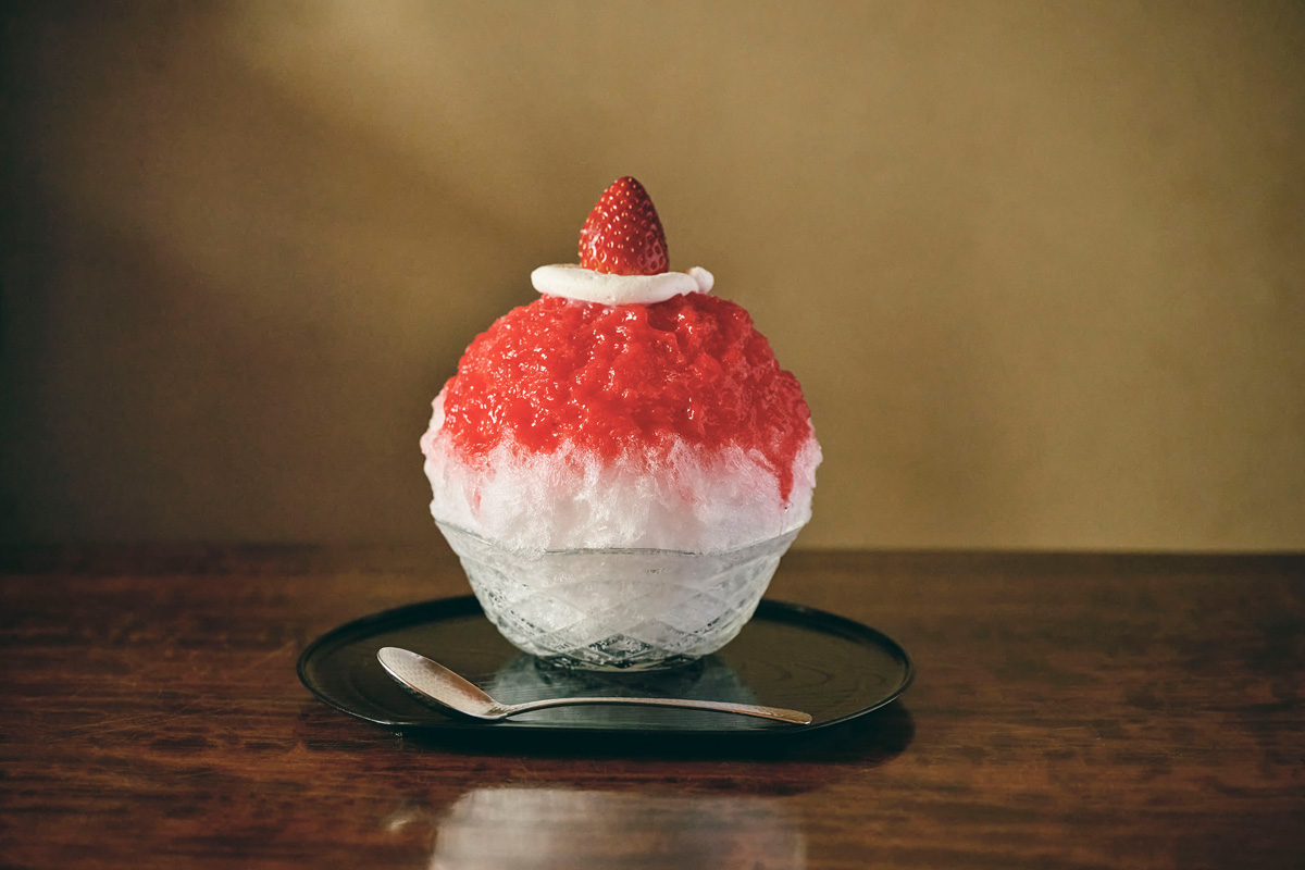 冬の時期の楽しみはイチゴ! おいしさを求めて産地を変えたり、複数の種類のイチゴを組み合わせて、鮮やかな色合いと香りのよさをもたせる。削った氷の中にキャラメリゼしたポン菓子やナッツ、あんこを忍ばせるなど、二度、三度と足を運んでも飽きさせない工夫も魅力だ。