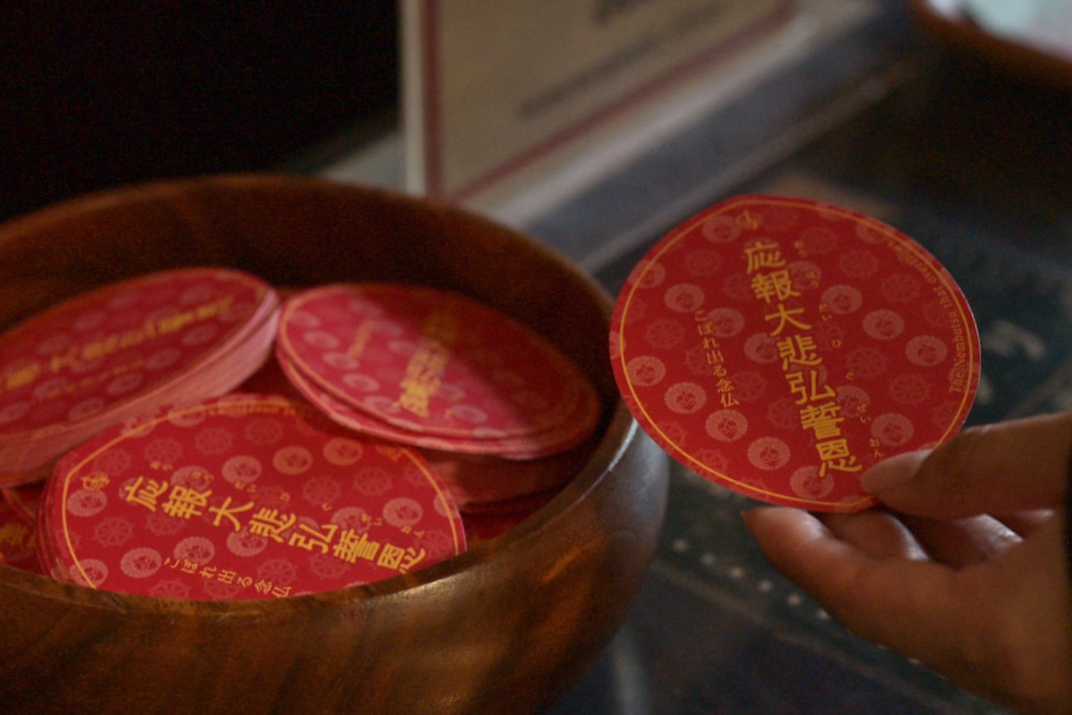 「御朱印帳は、御朱印をもらうことに満足をしてしまいがち。それは自分の欲望を満たすためだけの行為ですよね。けれども、浄土真宗は自分の欲望や煩悩があることに気づくことを目的としているので、御朱印を置いてないんです。でも、御朱印帳がない代わりに、スタンプと参拝記念カードは置いていますよ。」