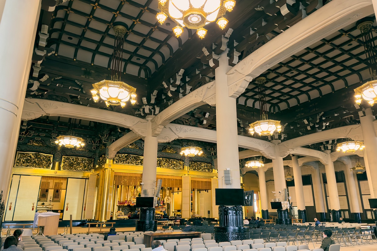 東森さんは奈良県出身。お茶を飲んで小話をした後、早速、築地本願寺の本堂を案内してくれた。