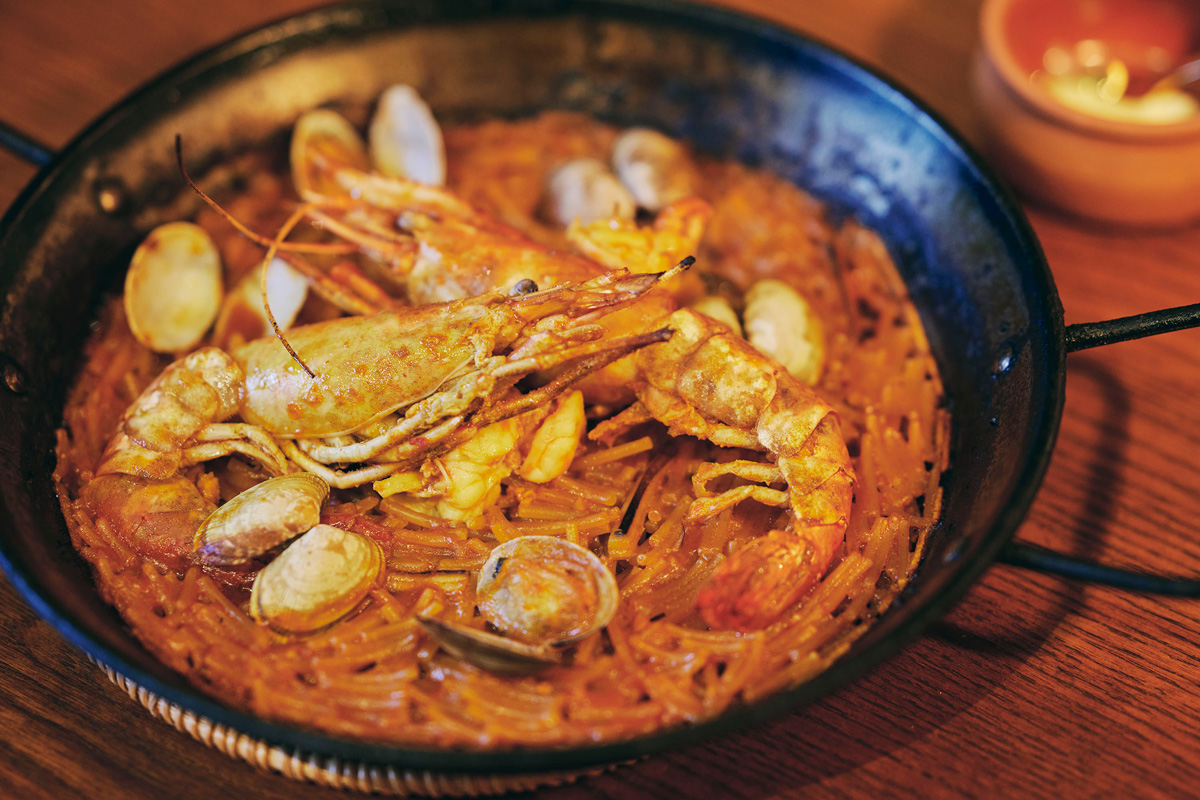 「スペイン料理と言えば真っ先に『パエリア』を思い浮かべる人が多いと思いますが、私のおすすめは『魚介のフィデウア』。前者が米料理なのに対して、後者は細いパスタを折って使い、パエリア同様にダシをたっぷり吸わせて仕上げます」と浅井さん。