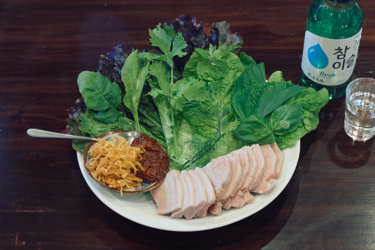 看板メニューはきめ細かい肉質が自慢の豚肉、メキシコ産ミスポークを毎日3~4時間かけて低温調理で仕込んだゆで豚「ポッサム」。サンチュやエゴマ、そして好みのハーブと一緒に包んで、サムジャン(味噌ダレ)でいただく。口に含むとしっとりとジューシーでやわらかく、爽やかなハーブの香りが食欲を刺激する。