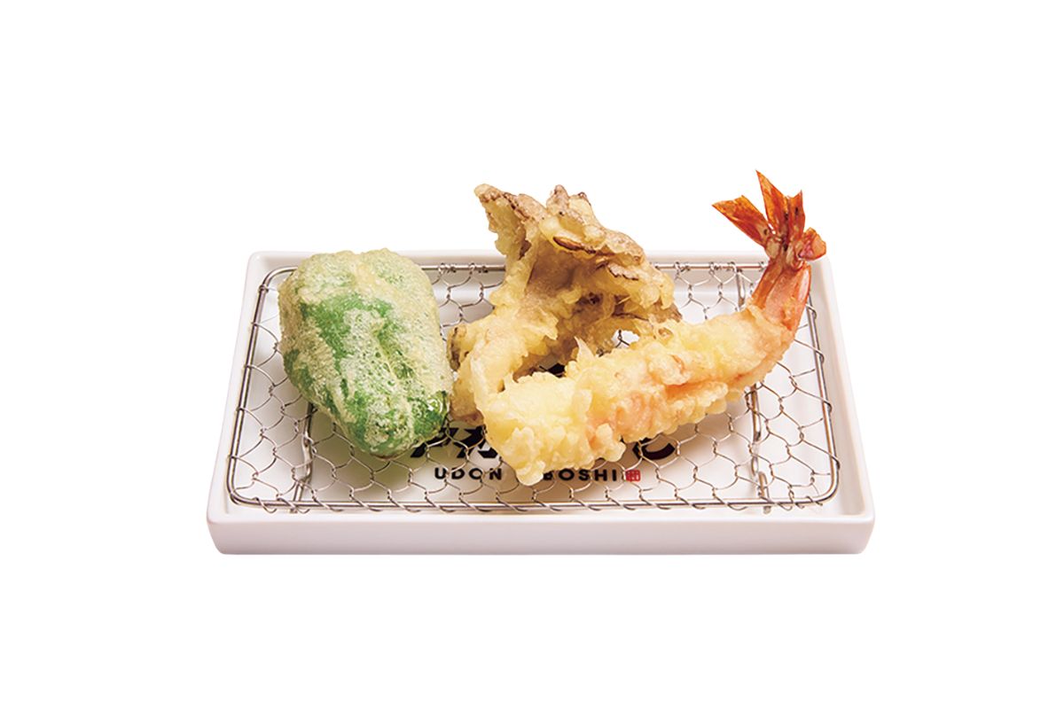 うどんの種類は、温かい「かけうどん」または冷たい「おろしぶっかけうどん」のみ。これに天ぷらやトッピング類をプラスして好みの一杯にカスタマイズするのがこちら流だ。