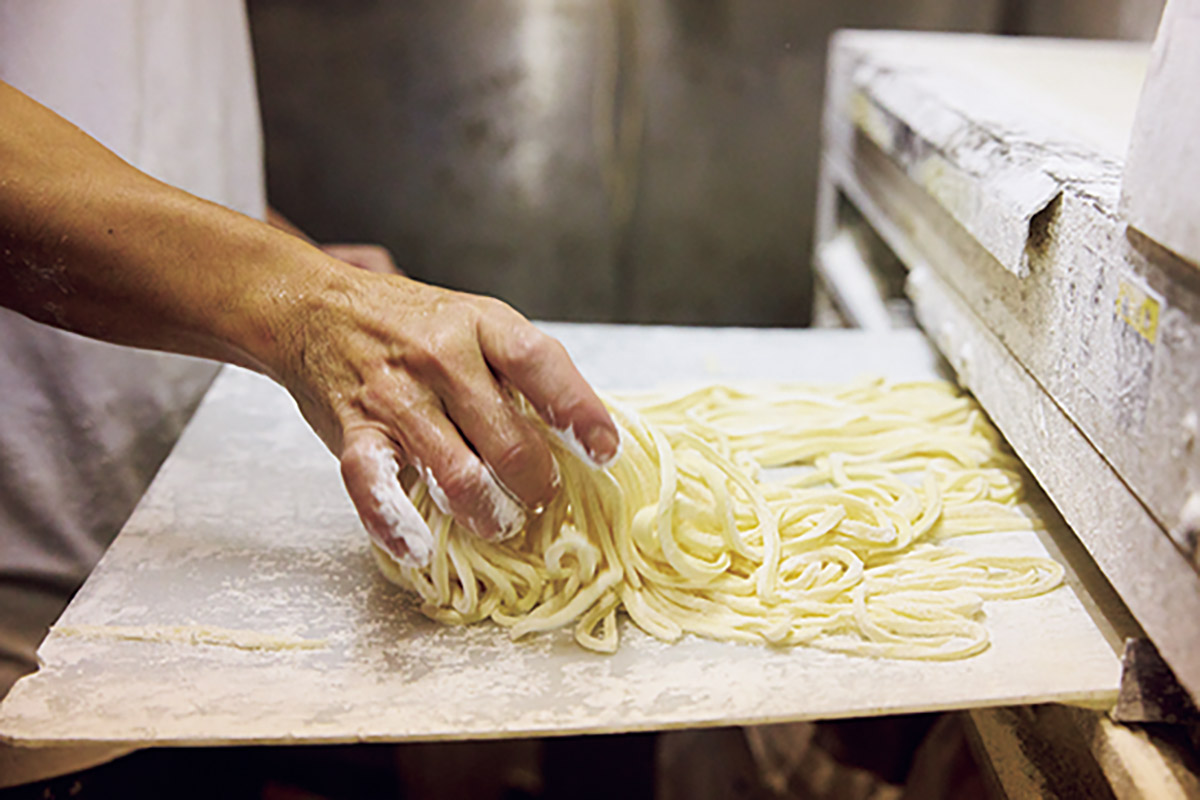 「豊前裏打会」という、うどんの流派があるのをご存じだろうか。北九州・小倉の名店〈津田屋官兵衛〉で修業し、独立した麺職人のお店だけが入れる会で、探究心の強いメンバーが切磋琢磨しているという。その中で〈大地のうどん〉は、福岡市西区の本店を筆頭に県内に7軒の支店がある一大勢力だ。