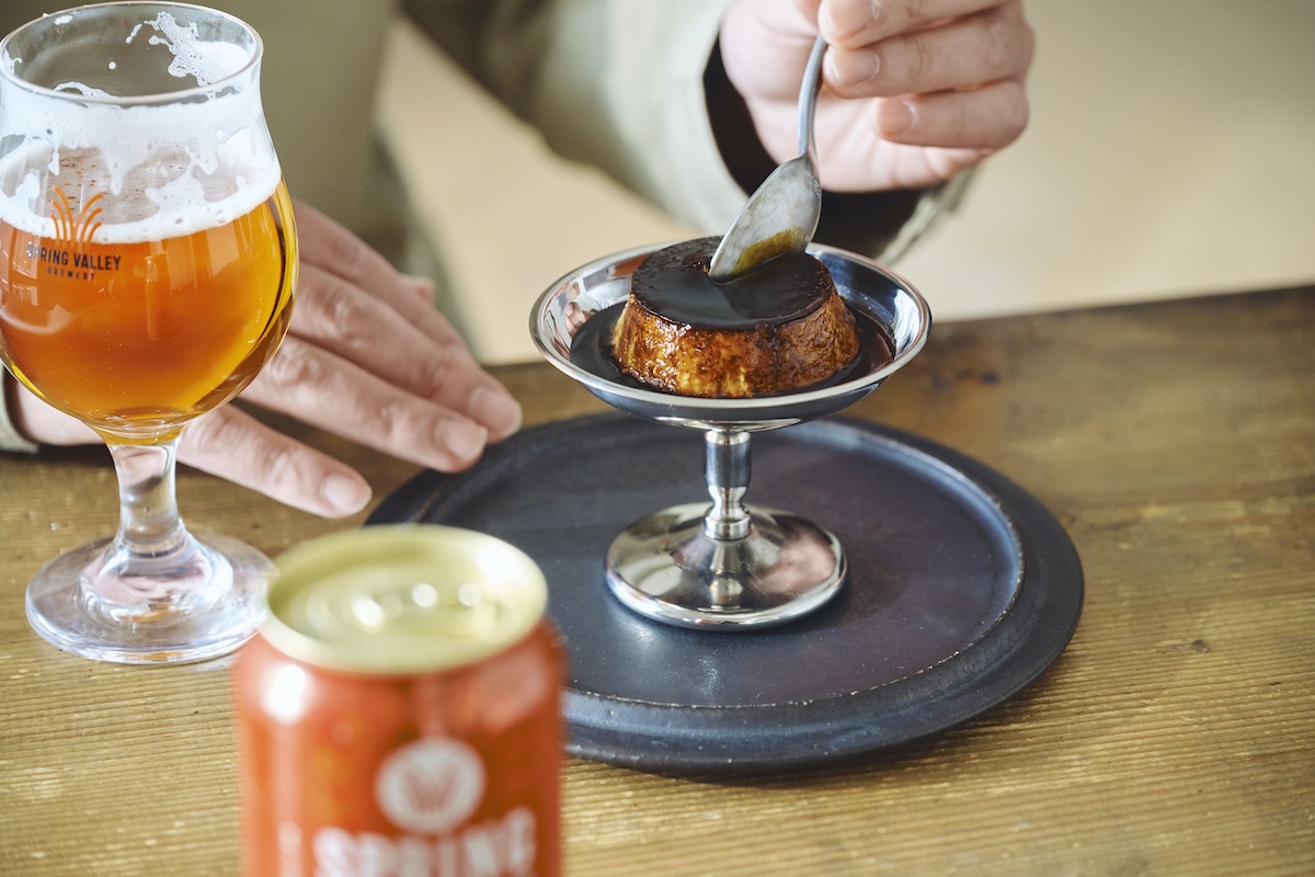 〈ドルチェ タクボ〉の看板アイテムの一つ、その名も「王道を塗り替える濃厚プリン」に「SPRING VALLEY BREWERY」の代表作「豊潤ラガー 496」を合わせる。このペアリングを提案したのは、実は田窪シェフでした。