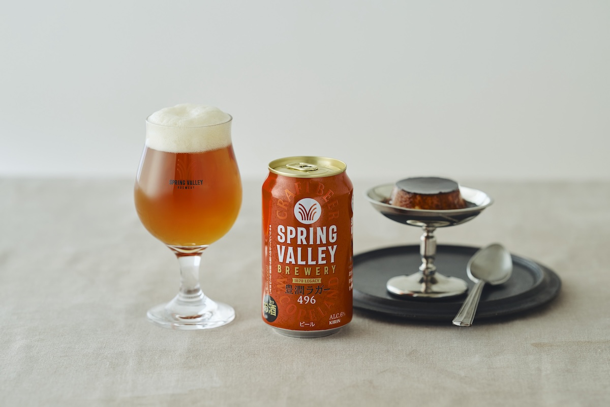 麦芽のコクとホップの香りが広がる「SPRING VALLEY BREWERY 豊潤ラガー 496」には、ほろ苦なカラメルの「プリン」を合わせて。