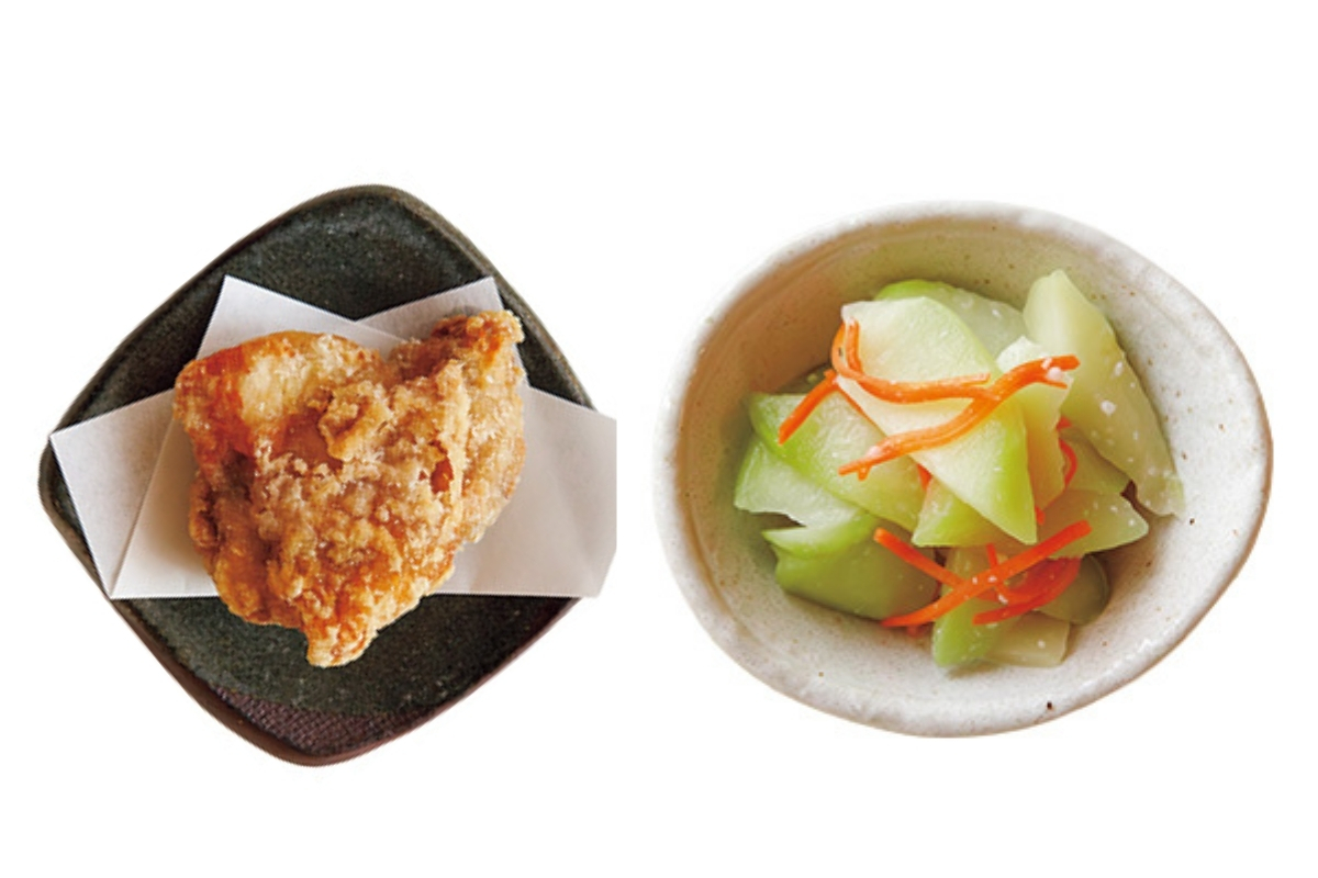 左・塩からあげ140円(1個)。大ぶりでジューシー! 右・イートイン用のおむすび2個セットに含まれる小鉢は日替わりで4~5種からひとつ選ぶことができる。