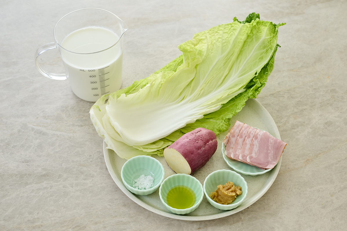 ②市販のだしを使わず、白菜とサツマイモの甘み、ベーコンの塩味、味噌のコクで、旨みがアップ。