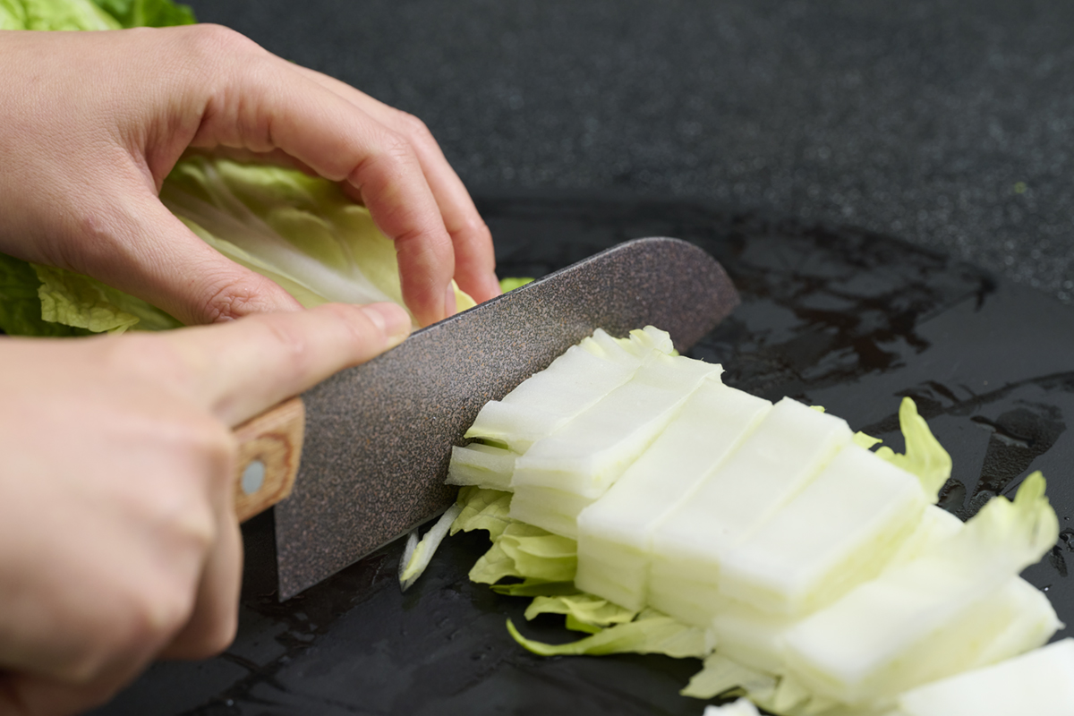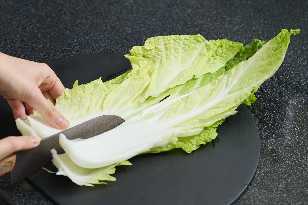 ①白菜の葉は、縦半分に切ったら、1.5cm幅くらいにザクザク切る。