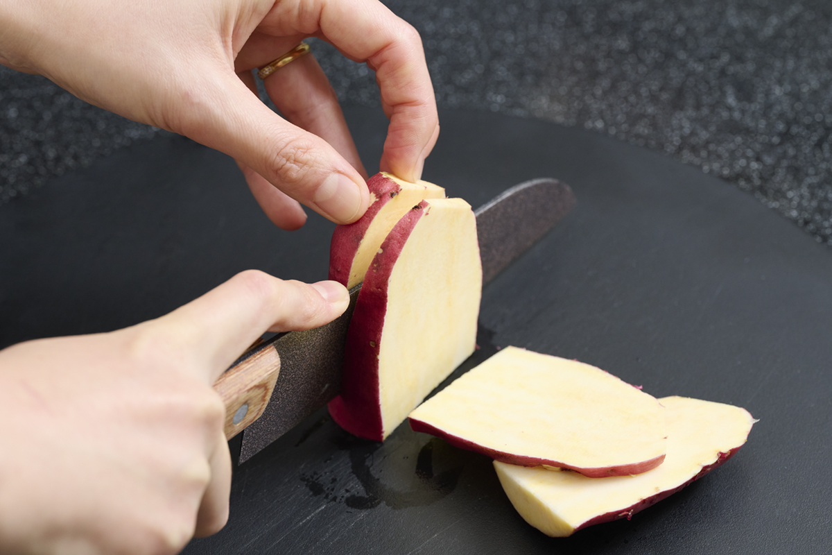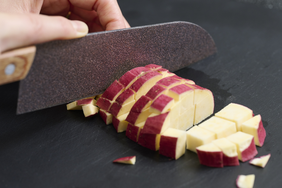②サツマイモは縦に1cm幅に切り、1cmくらいの角切りにする。