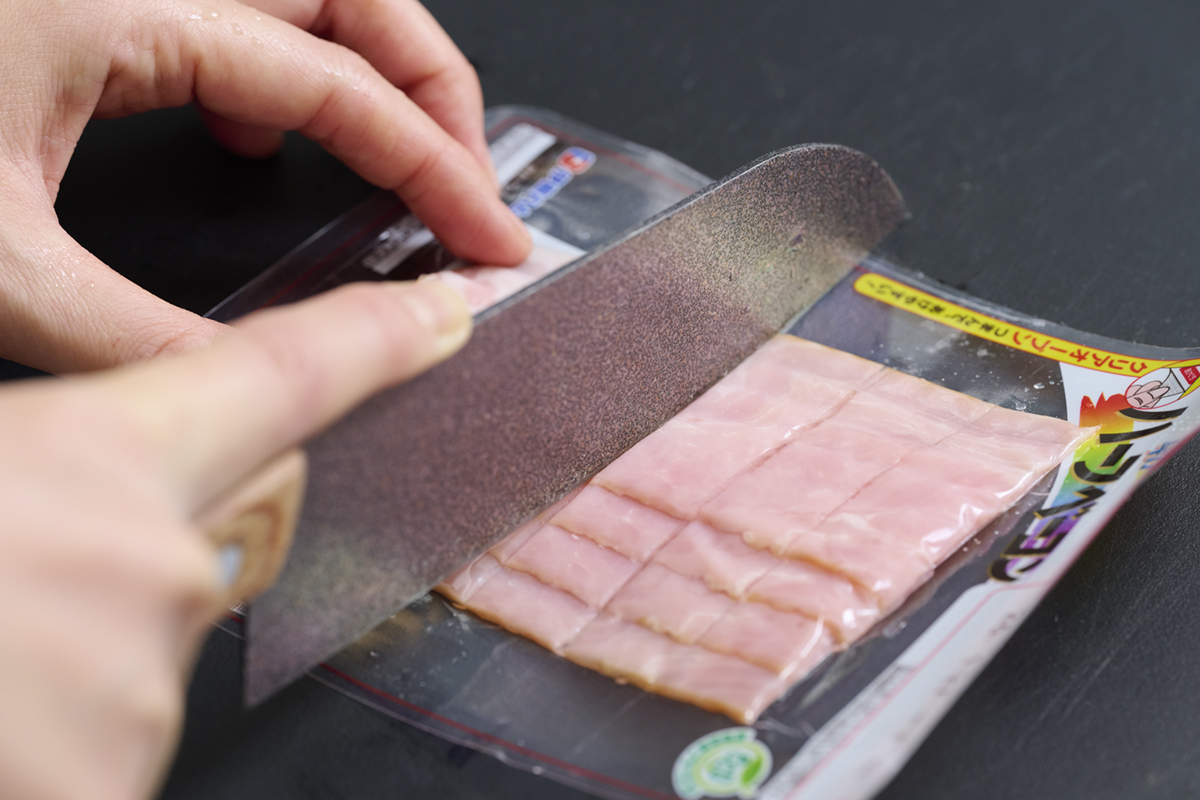 ③パックされたベーコンを使う場合、パックの上からでも切ることができて、包丁が汚れない。