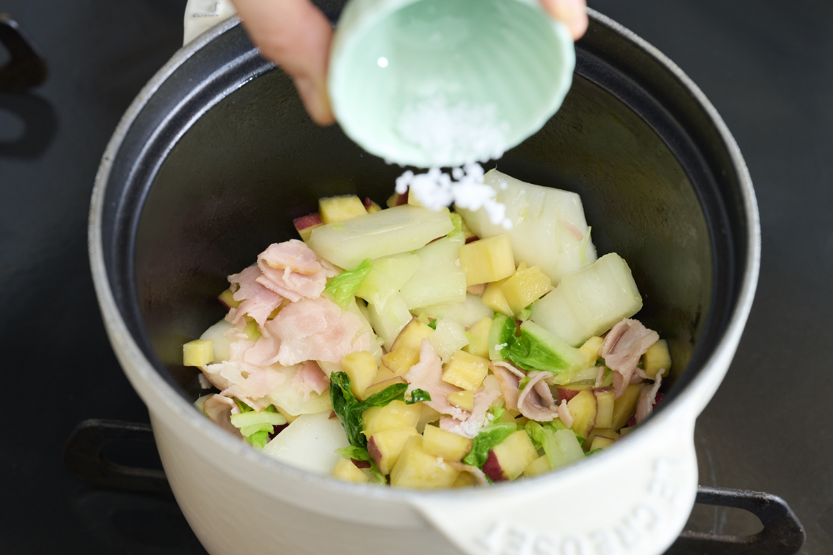 ④鍋にオリーブオイルをひき、白菜とサツマイモを炒める。軽く火が入ったらベーコンを入れて炒め、塩を加えて全体に絡ませる。ここでしっかり味付けをしておくことが、美味しく仕上げるコツ。