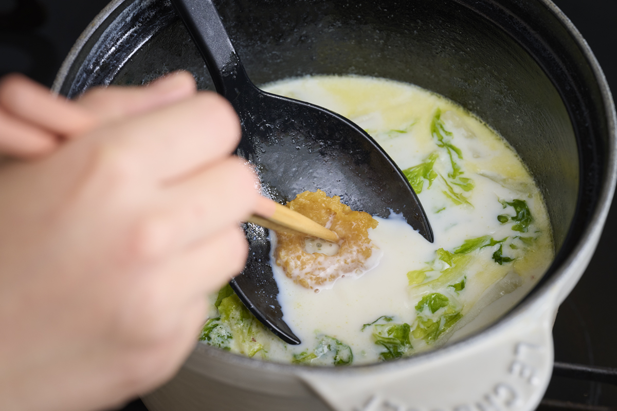 ⑤ ④に牛乳を注いだら蓋をして、5〜10分弱火でクツクツ。仕上げに味噌を溶いたら出来上がり。