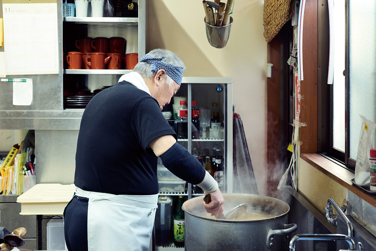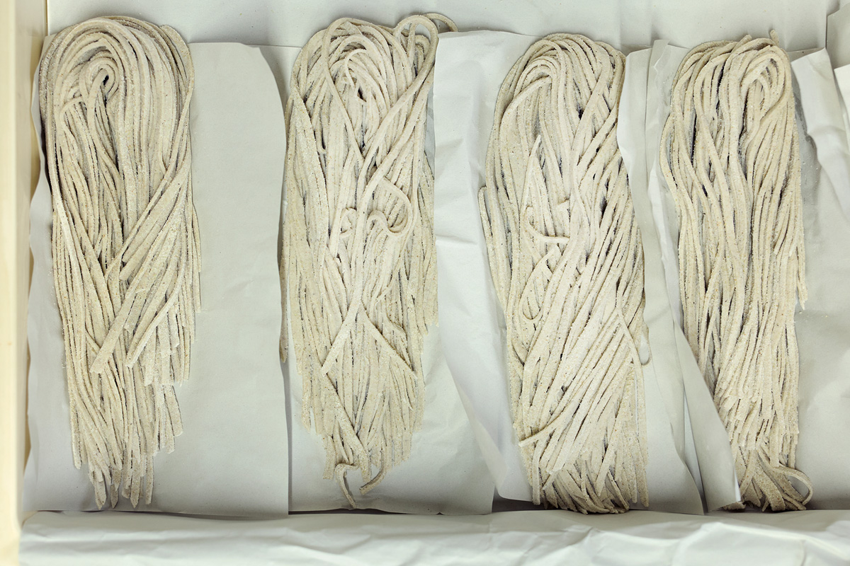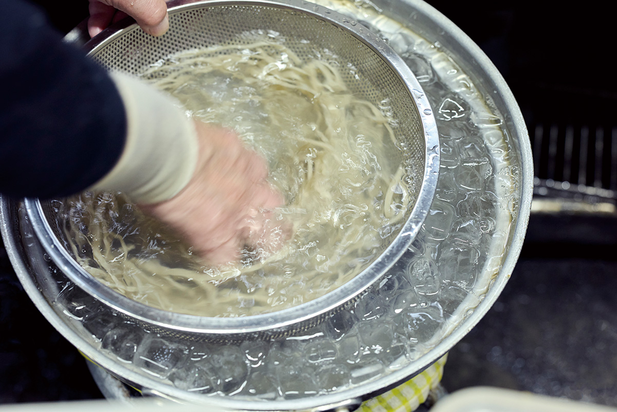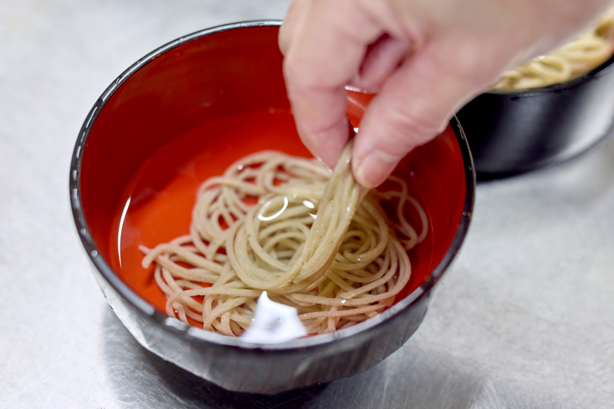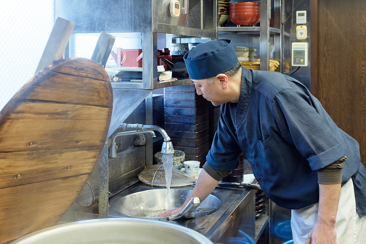 石臼で自家製粉するのは、大粒の北海道·新得産と小粒の南会津·舘岩産のブレンド。安全性をクリアした敷地内の井戸から吾妻山の伏流水を汲み上げ、生地を捏ねて伸ばし、釡茹で。出来たては緑がかった色が美しい。特有の歯応えを味わうべく、この色がきれいなうちにいただくのが鉄則だ。